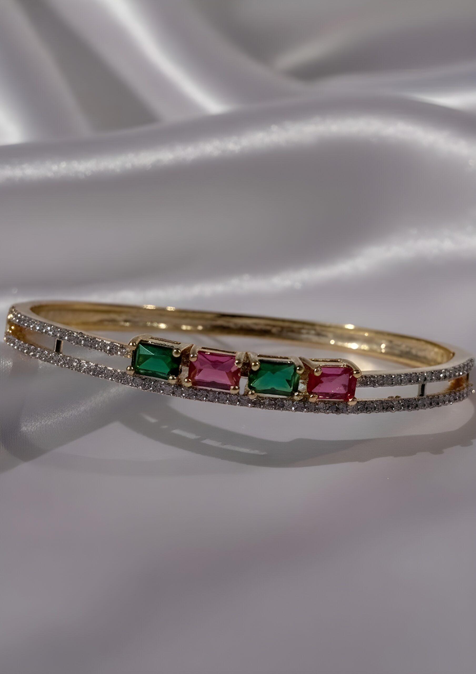 Graceful, minimal, and effortlessly elegant — this stone-studded gold-tone bracelet is designed for those who appreciate understated luxury. Featuring finely set colored stones on a sleek band, it adds just the right hint of sparkle without overpowering your look.