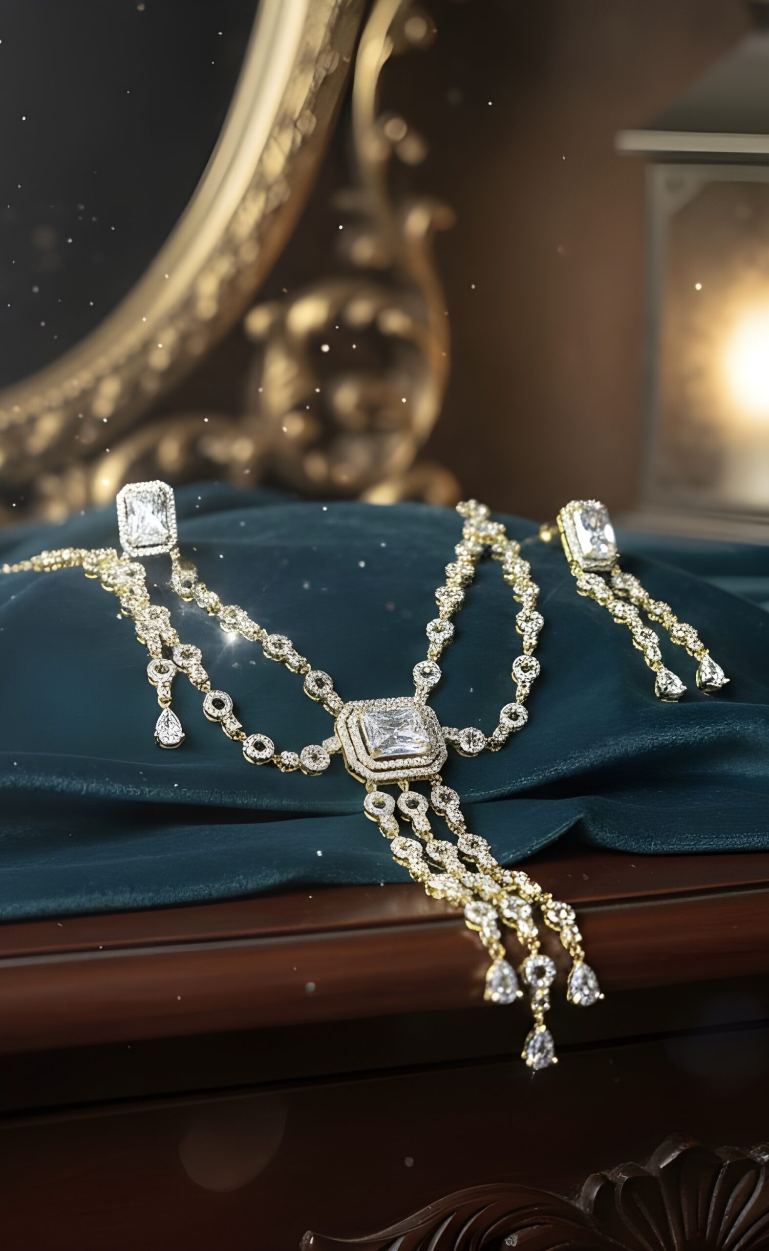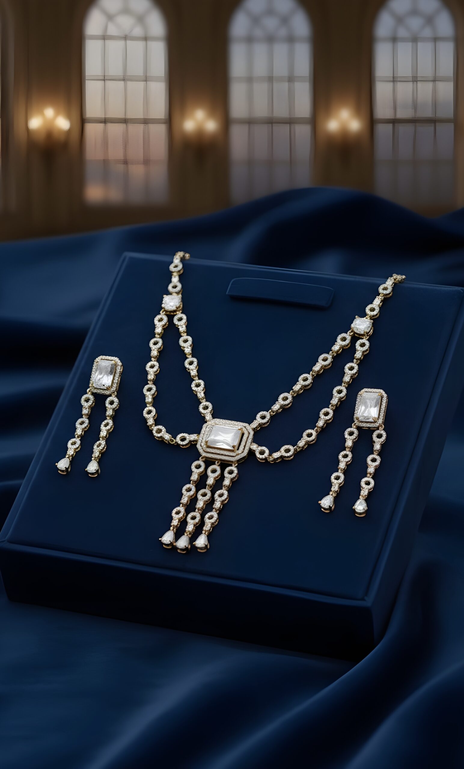 Make your special moments unforgettable with this stunning necklace. Designed to add regal charm, it features detailed craftsmanship that enhances bridal and festive looks. A must-have piece for weddings, receptions, and grand celebrations.