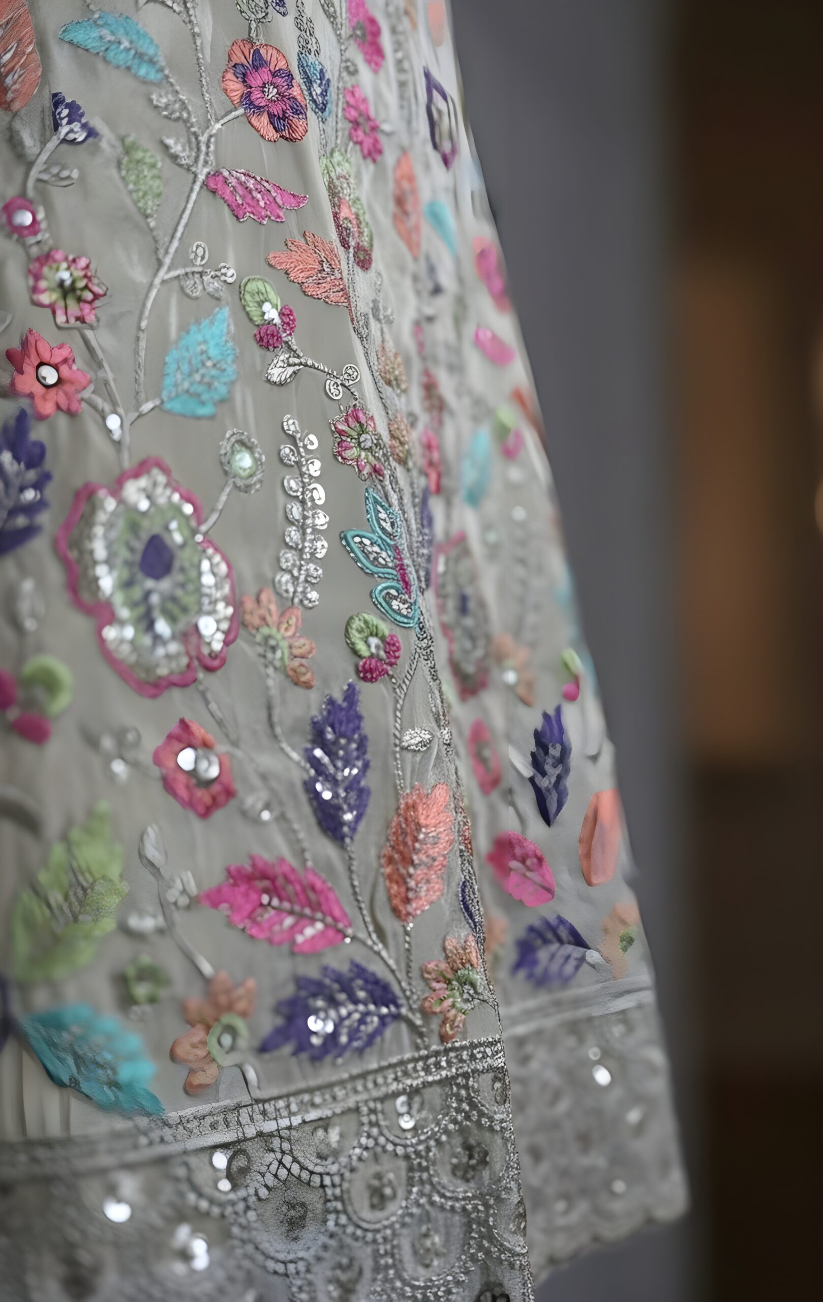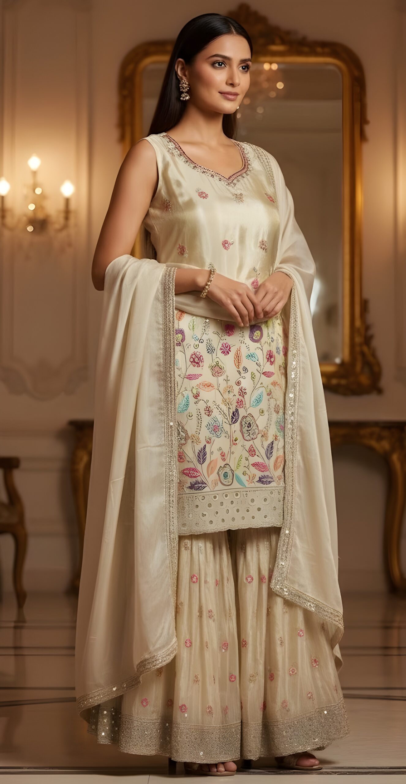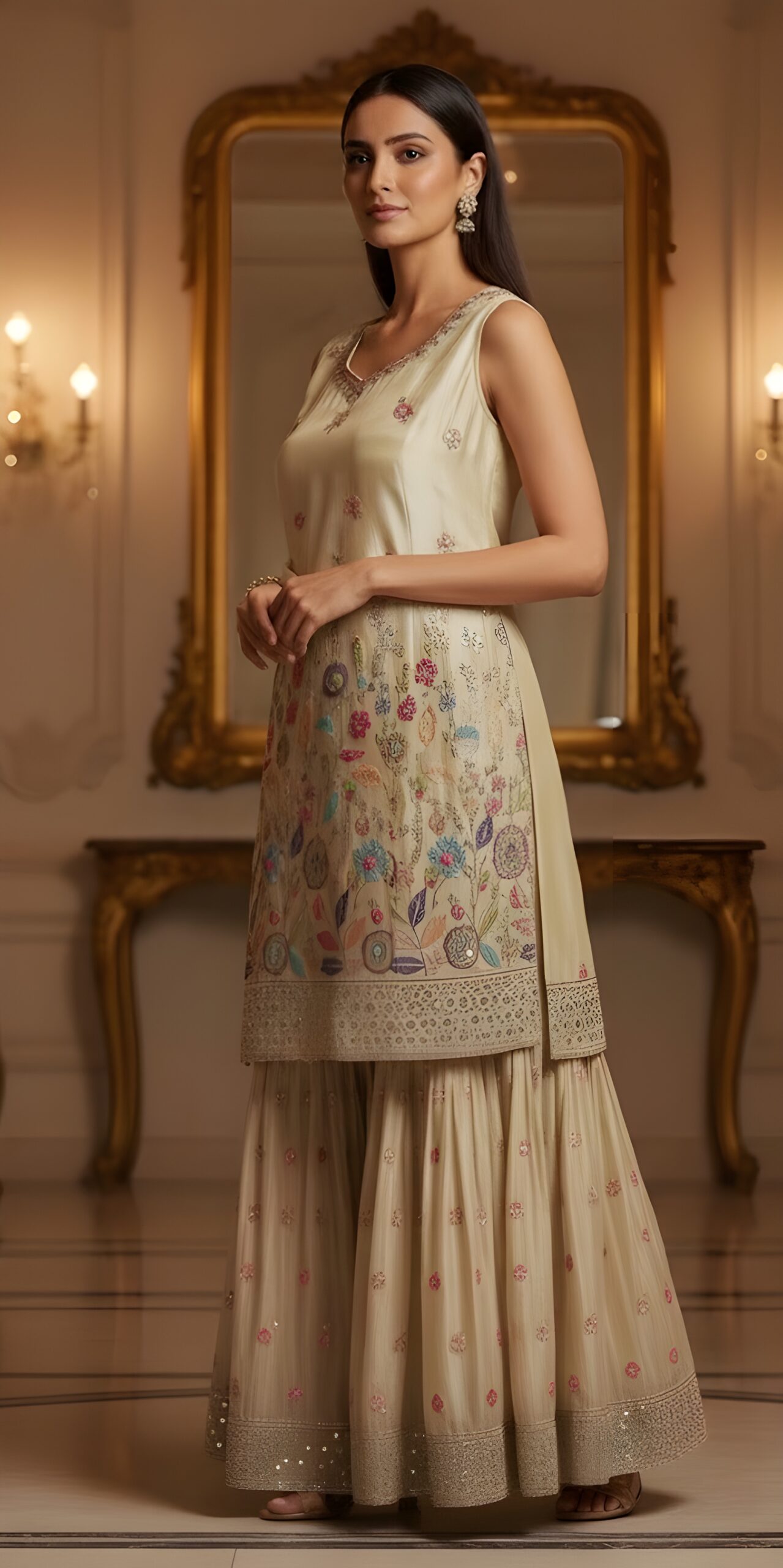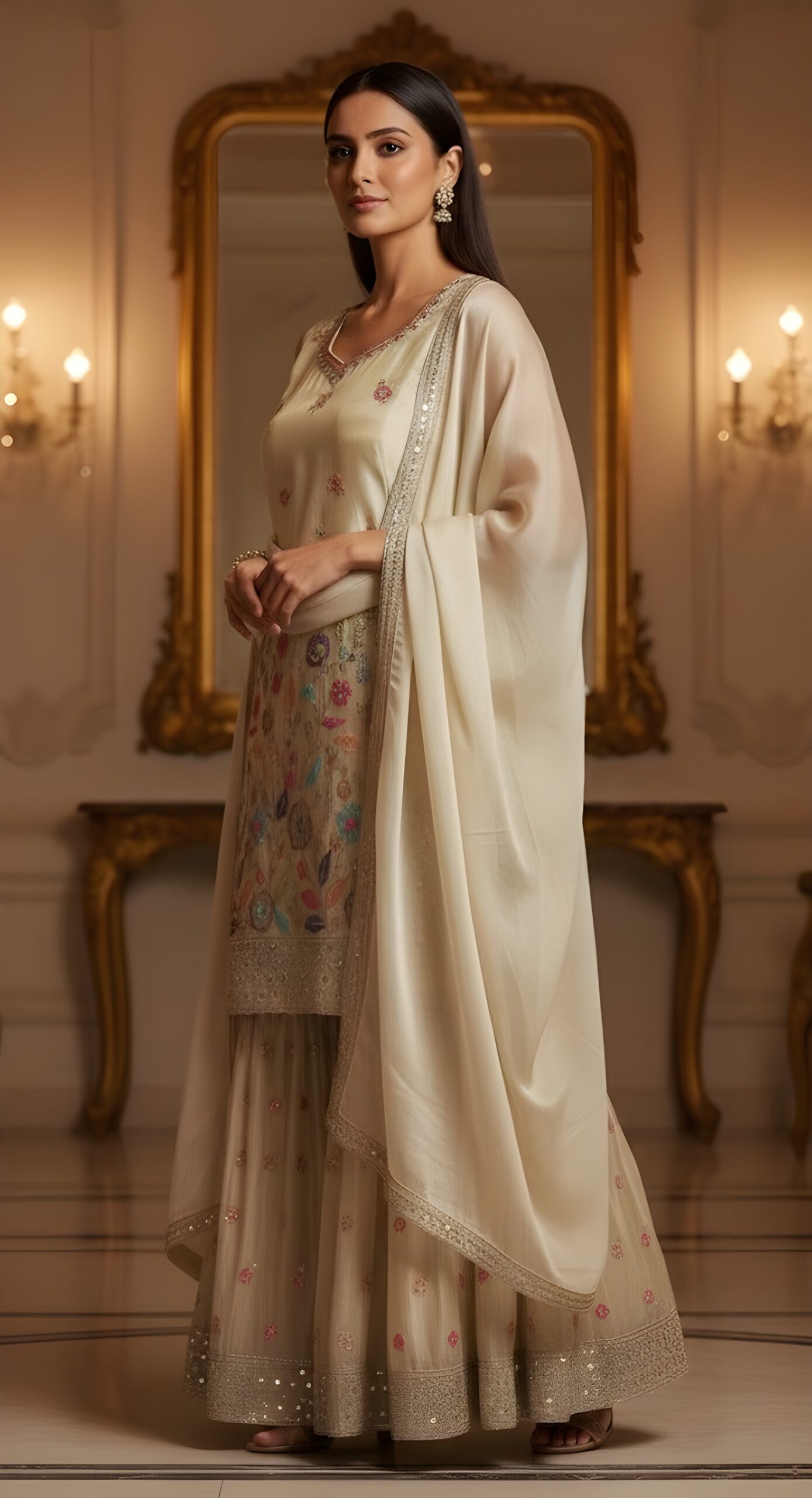 tep into timeless elegance with this beautifully crafted embroidered kurta sharara set. Designed in a soft, graceful tone with intricate floral embroidery, this ensemble reflects refined craftsmanship and understated luxury.
