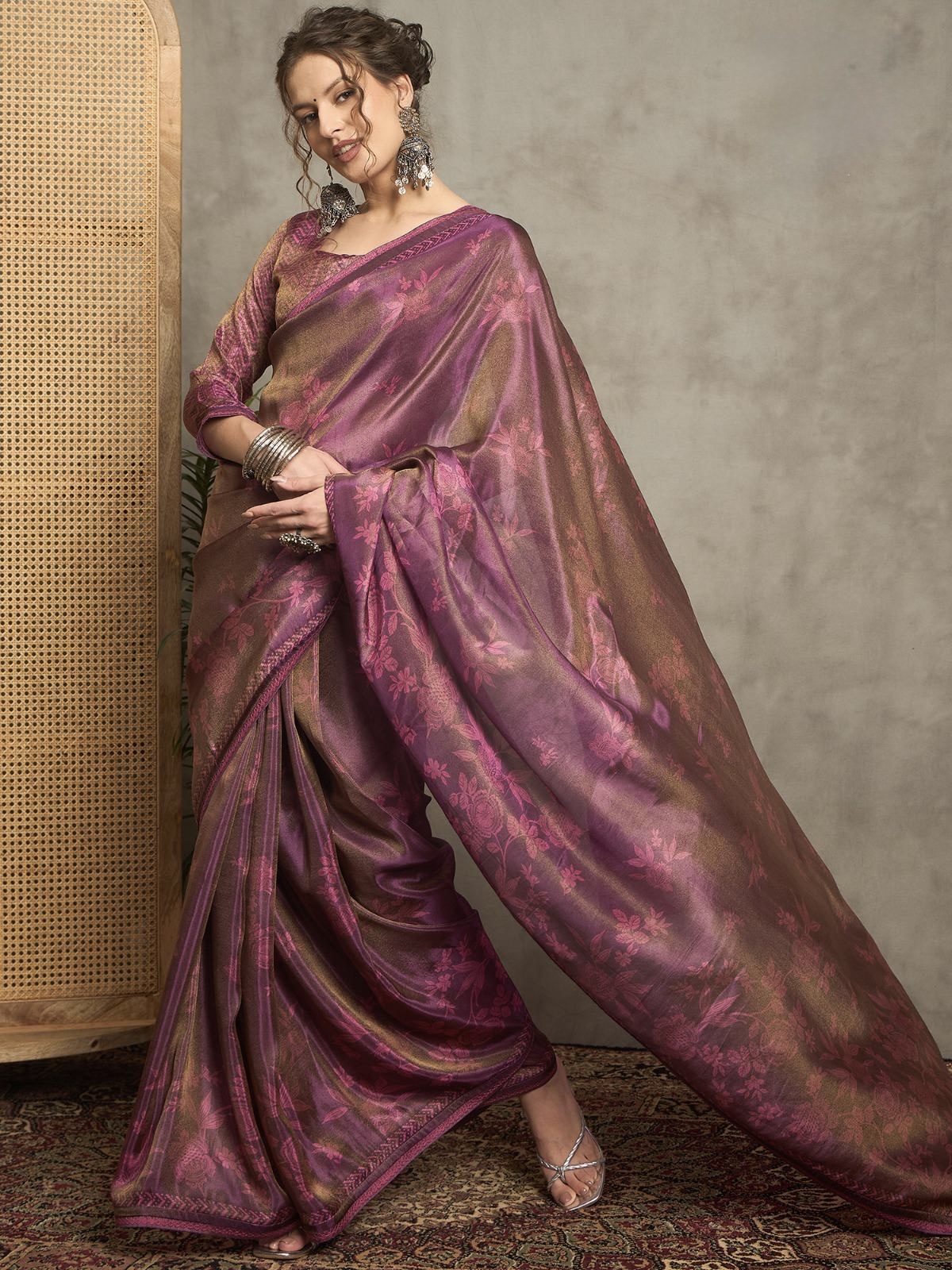 Blouse: The sarees are paired with matching tone-on-tone blouses made from the same viscose tissue silk, featuring complementary sleeve borders.