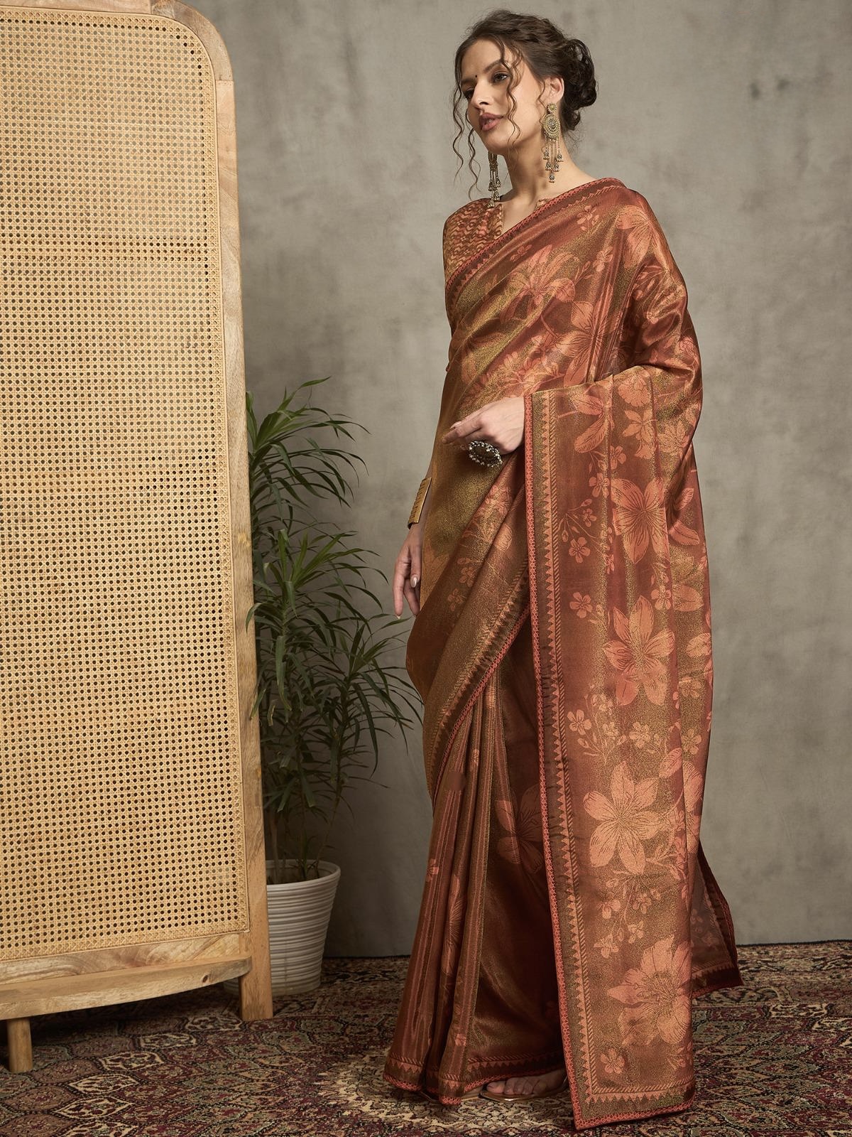 Floral Patterns: The sarees feature intricate jacquard-style floral weaving. Some (like the Copper and Steel Blue) feature larger, more prominent blooms, while others (like the Mauve) have more delicate, trailing vine patterns.