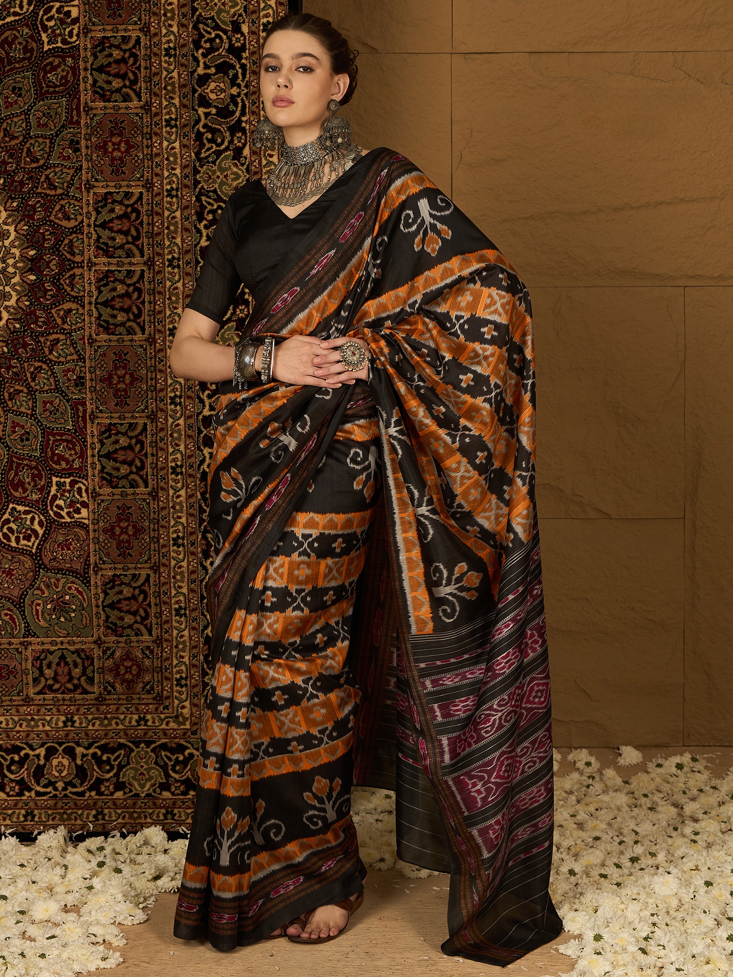 Elevate your ethnic wardrobe with this striking black and rust Bhagalpuri silk saree, crafted to reflect timeless elegance and traditional artistry. The rich color contrast combined with intricate motifs creates a bold yet sophisticated look.